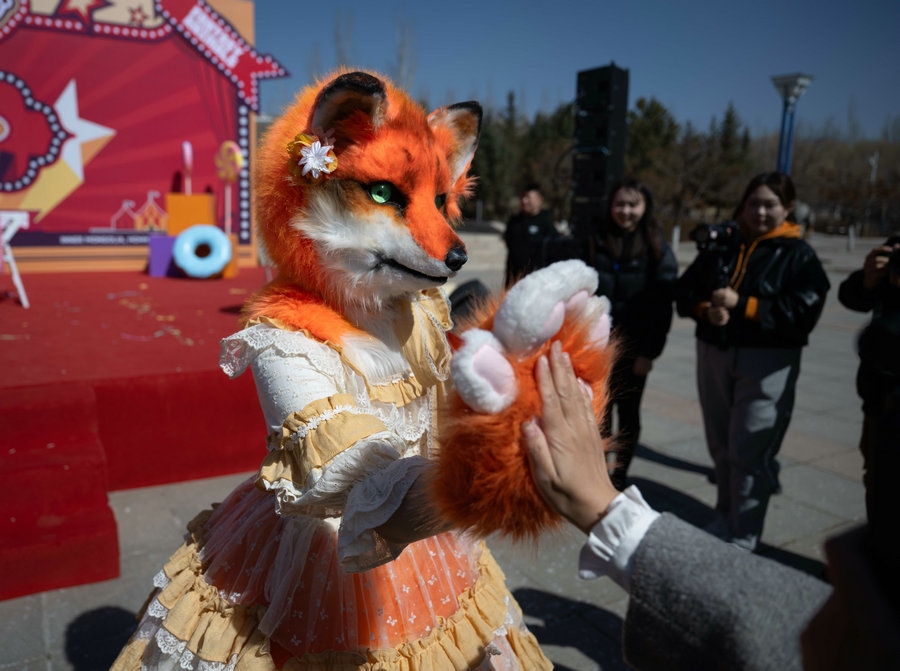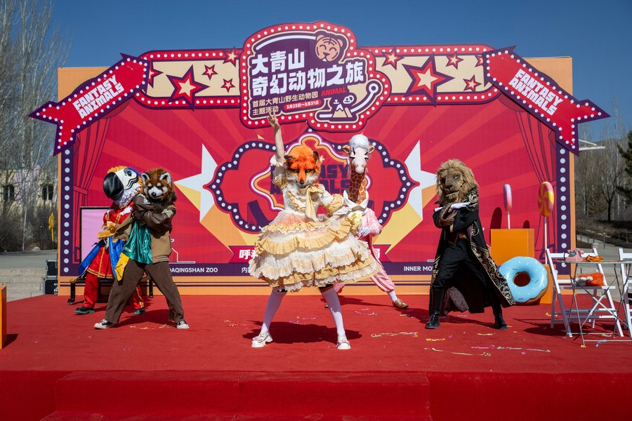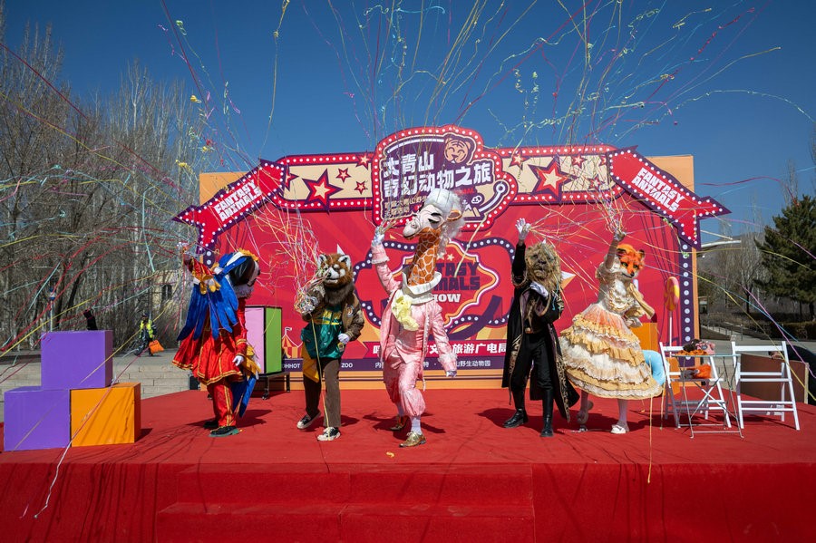 3月22日上午,在內(nèi)蒙古呼和浩特大青山野生動(dòng)物園里,5只動(dòng)物人偶正在為23日舉行的國(guó)內(nèi)大型動(dòng)物主題互動(dòng)巡游偶劇《奇幻動(dòng)物城》彩排。