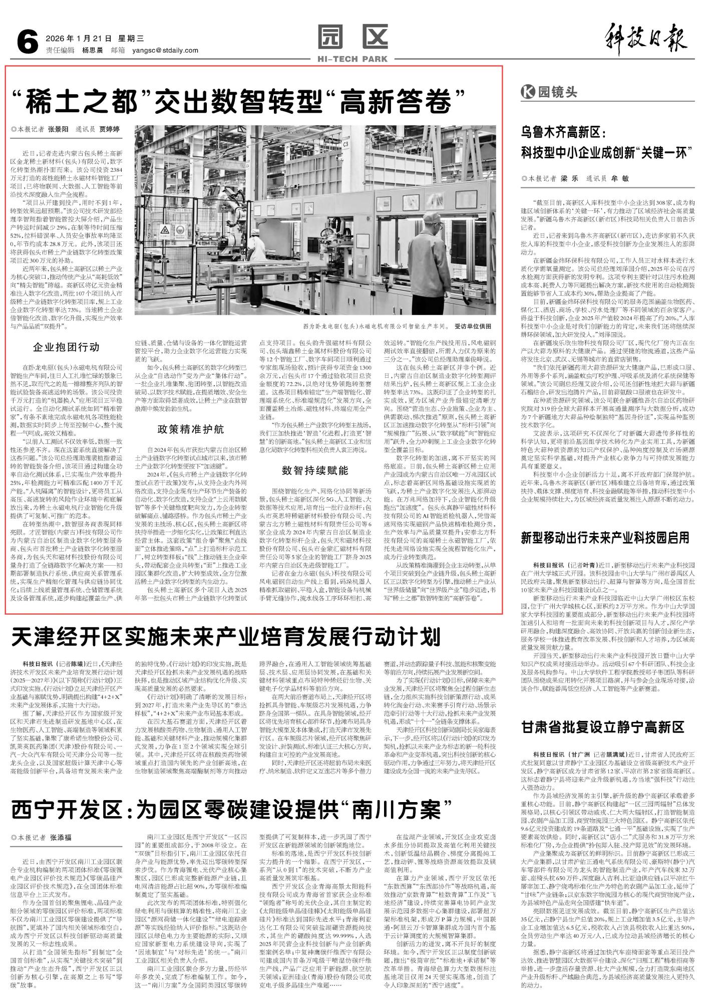 2026年1月21日《科技日報》第6版刊發(fā)了《“稀土之都”交出數(shù)智轉型“高新答卷”》的文章,報道了從政策精準滴灌到企業(yè)主動轉型,從單個項目突破到全產(chǎn)業(yè)鏈升級,包頭稀土高新區(qū)正以數(shù)字化轉型為引擎,推動稀土產(chǎn)業(yè)從“世界級儲量”向“世界級產(chǎn)業(yè)”穩(wěn)步邁進,書寫“稀土之都”數(shù)智轉型的“高新答卷”。
