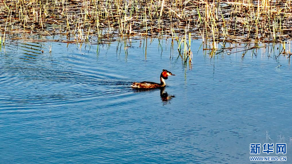 5月29日,在赤峰市松山區(qū)銀河谷濕地,鳳頭鸊鷉在水中覓食。