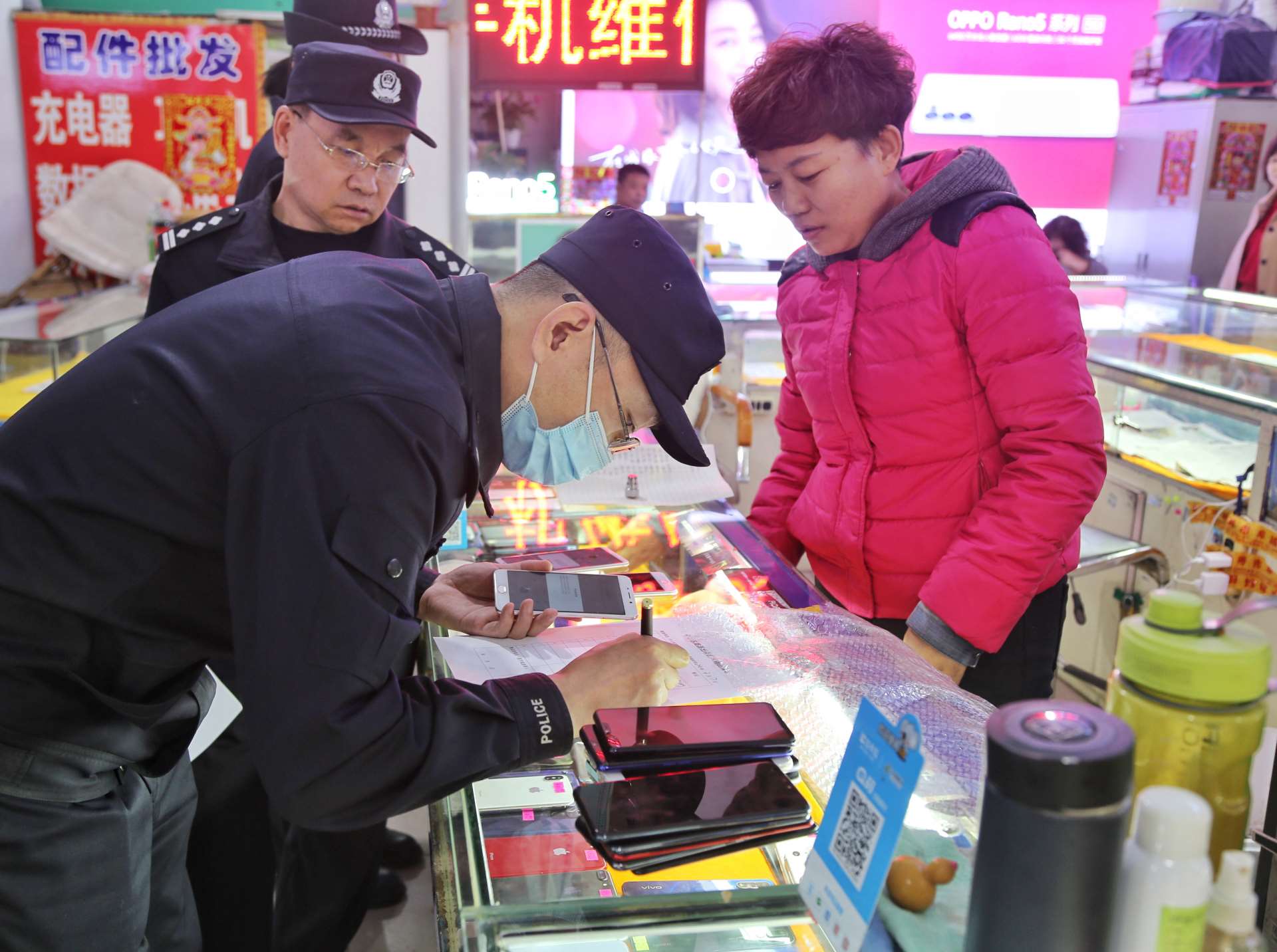 按照預(yù)定方案,行動分為四組,兩組對永和二手手機市場和眾興二手手機市場進(jìn)行突擊清查,另兩組以便衣形式對周圍流動收售手機人員進(jìn)行排查。行動期間,民警對二手手機銷售店鋪內(nèi)的手機和工作人員情況進(jìn)行清查,逐一對照登記臺賬,嚴(yán)格檢查落實情況,同時向經(jīng)營業(yè)主及市民進(jìn)行法制宣傳教育。此次行動共排查登記二手手機850部,買賣二手手機人員50余人,檢查二手手機商戶22家,暫扣未履行登記手機30余部。