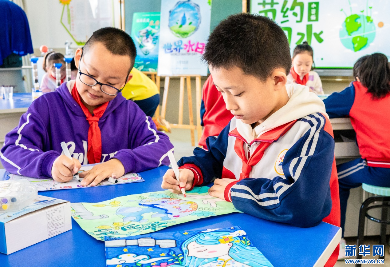 ??3月20日,呼和浩特市玉泉區(qū)石東路小學(xué)學(xué)生在繪制以“節(jié)約用水 從我做起”為主題的手抄報(bào)。新華網(wǎng)發(fā)(丁根厚 攝)