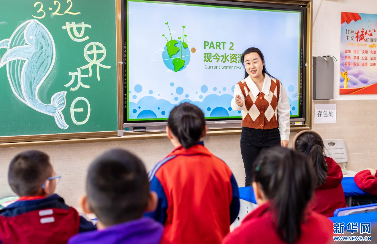 ??3月20日,呼和浩特市玉泉區(qū)石東路小學(xué)老師向?qū)W生們講解水資源現(xiàn)狀等知識。新華網(wǎng)發(fā)(丁根厚 攝)