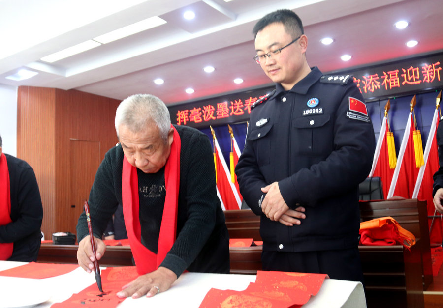 活動現(xiàn)場氣氛熱烈,書法家們鋪展紅紙、揮毫潑墨,將自己的書法造詣轉(zhuǎn)化為民警們喜聞樂見的傳統(tǒng)藝術(shù)形式,一幅幅吉祥如意的春聯(lián),一張張紅紅火火的“?!弊?,在展示傳統(tǒng)文化之美的同時,傳遞著冬日溫暖,營造出文明祥和、時尚雅致的節(jié)日氛圍,讓在場人員感到了濃濃的年味。