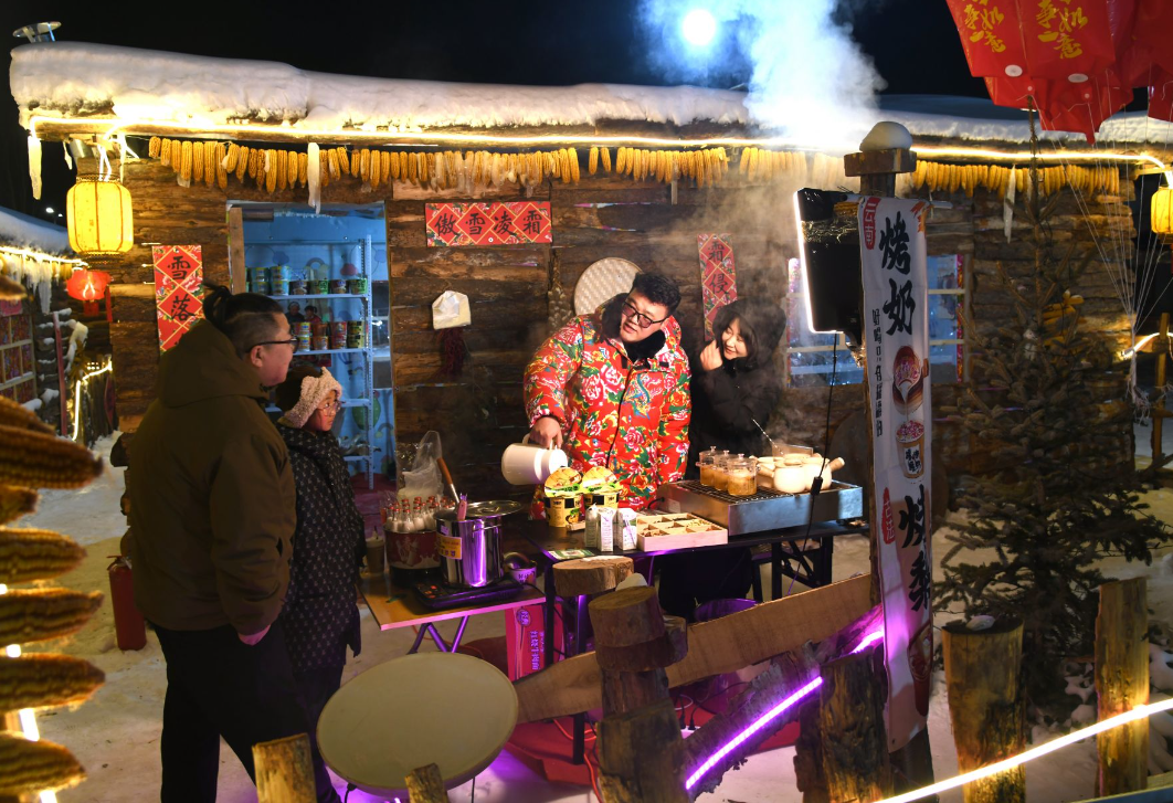 踏入雪鄉(xiāng)板塊,50個(gè)復(fù)刻北方傳統(tǒng)風(fēng)貌的院落集群映入眼簾,木柵欄上垂掛的紅燈籠與蓬松雪層相映成趣,屋檐下懸垂的雪舌、雪簾勾勒出童話般的輪廓。每個(gè)院落都藏著專屬打卡場(chǎng)景,推門而入可見(jiàn)家庭場(chǎng)景,窗外是皚皚白雪,屋內(nèi)飄著燒烤、火鍋和奶茶的醇厚香氣,瞬間驅(qū)散冬日寒意。游客穿梭其間,鈴鐺輕響,為這份雪鄉(xiāng)煙火氣增添了濃郁的民族風(fēng)情。