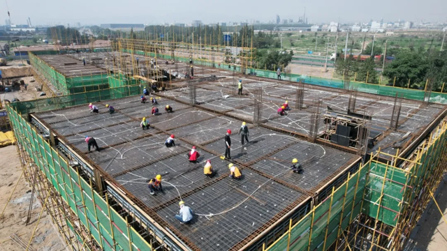 “目前,項目正在進行基礎(chǔ)設(shè)施施工,辦公樓已完成1層封頂,1號車間正在進行主體結(jié)構(gòu)的鋼管架的搭設(shè)和模板制作,外網(wǎng)工程和2號、3號車間基礎(chǔ)施工也在順利推進?!表椖渴┕挝回撠熑送跣闵礁嬖V記者,該項目計劃今年8月底完成辦公樓、綜合服務(wù)樓主體施工,9月中旬完成3個車間主體施工。
