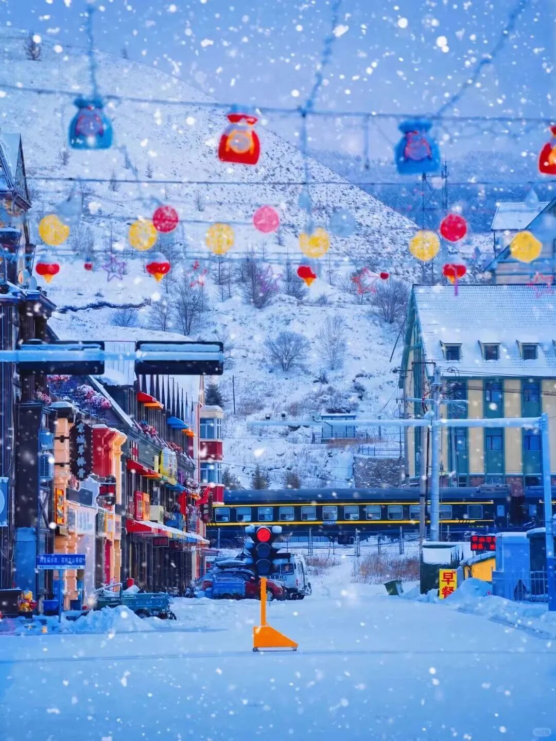 登上白狼峰觀景臺,俯瞰一望無際的林海雪原,夕陽西下時(shí),整片雪原被染成溫柔的金色,寒風(fēng)掠過,雪花漫舞,這一刻的壯闊,足以治愈所有煩惱。走進(jìn)阿爾山雪村,木刻楞房頂著圓滾滾的“雪蘑菇”,紅燈籠在白雪中搖曳,晚上燈光一亮,暖黃色的光灑在雪上,感覺自己在童話里 。