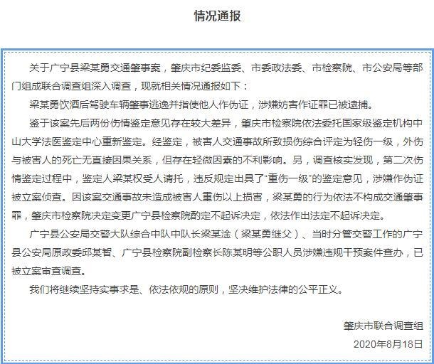 據(jù)肇慶市官方發(fā)布公眾號“肇慶發(fā)布”消息,關于廣寧縣梁某勇交通肇事案,肇慶市紀委監(jiān)委、市委政法委、市檢察院、市公安局等部門組成聯(lián)合調(diào)查組深入調(diào)查,通報相關情況:梁某勇飲酒后駕駛車輛肇事逃逸并指使他人作偽證,涉嫌妨害作證罪已被逮捕。