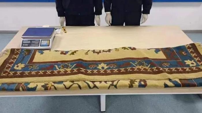 深圳郵局海關(guān)關(guān)員在對過境貨物開展監(jiān)管時發(fā)現(xiàn),1票包裹機檢圖像可疑,隨即對其開箱查驗。查驗發(fā)現(xiàn),該票包裹內(nèi)有一塊做工精致的地毯,編織到地毯內(nèi)的透明細(xì)塑料管中藏匿有細(xì)粉末一批,毛重11555.8克。經(jīng)現(xiàn)場試劑檢測,判斷為冰毒。目前,海關(guān)緝私部門已介入調(diào)查處理。