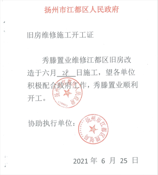 “搞定”西苑社區(qū)后,楊某軍偽造一份《揚州市江都區(qū)人民政府舊房維修施工開工證》,并加蓋“揚州市江都區(qū)人民政府 178962”“揚州市江都區(qū)規(guī)劃局”公章。周女士獲得該證后,立即組織顧先生進場施工。“楊某軍讓我先墊付材料款和人工費,后面等財政撥款就行。我就安排顧先生7月1日進場施工?!?/p>