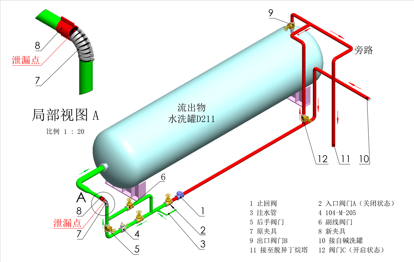 13時(shí)24分10秒,在新夾具兩側(cè)各安裝緊固1套螺栓時(shí),原夾具水平端的管道焊縫處突然斷裂,大量介質(zhì)從斷口噴出?,F(xiàn)場(chǎng)監(jiān)護(hù)人員立即向外疏散并安排烷基化裝置內(nèi)操人員緊急停車。