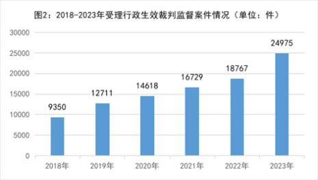 1.依申請監(jiān)督的行政生效裁判監(jiān)督案件數(shù)量逐年上升,反映出人民群眾對檢察監(jiān)督的更高需求。2018年以來當事人不服法院生效裁判向檢察機關(guān)申請監(jiān)督的案件分別是:2018年8697件、2019年11643件、2020年12933件、2021年14995件、2022年17186件、2023年22602件,年均增加21%。2023年16個省級檢察院受理行政案件數(shù)超過民事案件。當事人對裁判結(jié)果申請監(jiān)督的同時,很多情況下還對審判和執(zhí)行程序一并主張訴求,追求“看得見”的公平正義。