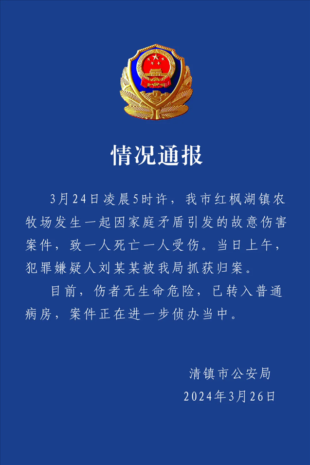央視網(wǎng)消息:據(jù)貴州清鎮(zhèn)市公安局,3月24日凌晨5時許,清鎮(zhèn)市紅楓湖鎮(zhèn)農(nóng)牧場發(fā)生一起因家庭矛盾引發(fā)的故意傷害案件,致一人死亡一人受傷。