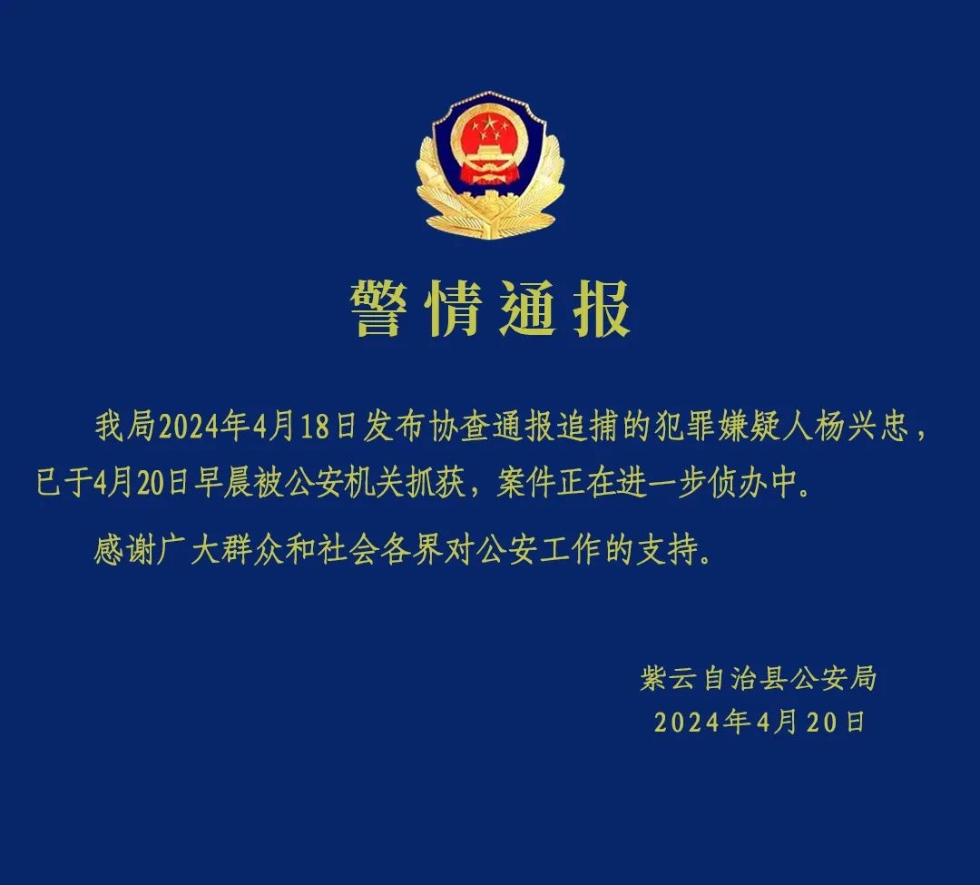 央視網(wǎng)消息:據(jù)“紫云公安”官微消息,紫云自治縣公安局4月18日發(fā)布協(xié)查通報(bào)追捕的犯罪嫌疑人楊興忠,已于4月20日早晨被公安機(jī)關(guān)抓獲,案件正在進(jìn)一步偵辦中。