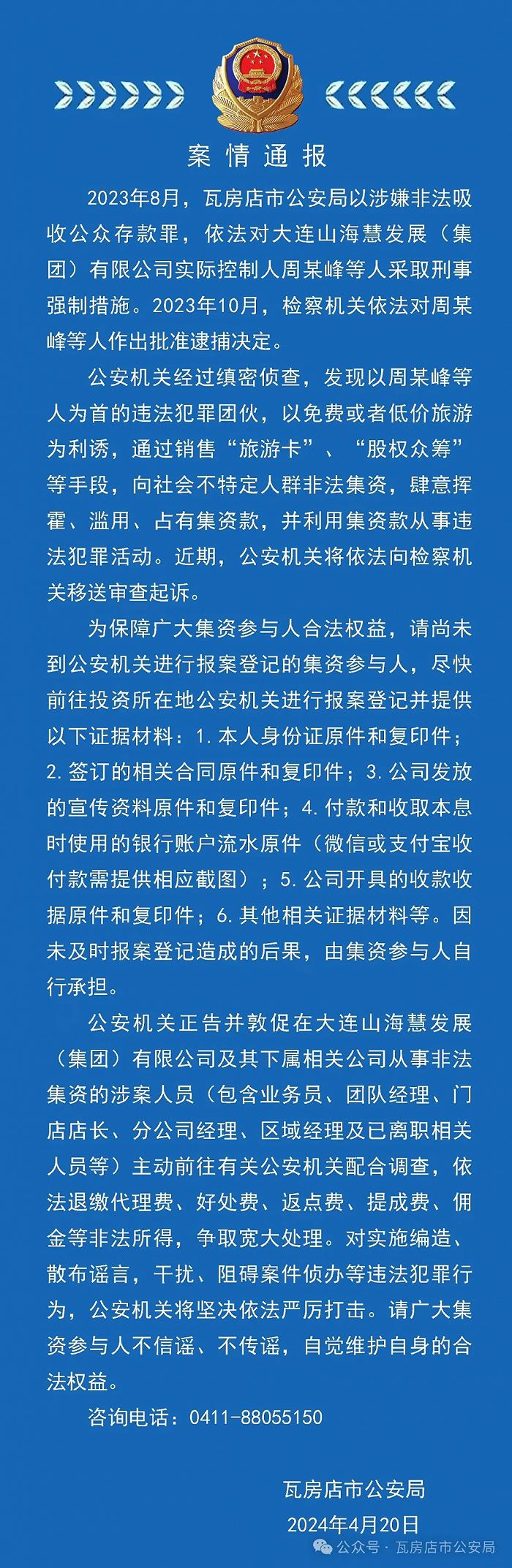 央視網(wǎng)消息:據(jù)瓦房店市公安局官微消息,遼寧瓦房店市公安局通報,2023年8月,瓦房店市公安局以涉嫌非法吸收公眾存款罪,依法對大連山海慧發(fā)展(集團)有限公司實際控制人周某峰等人采取刑事強制措施。2023年10月,檢察機關(guān)依法對周某峰等人作出批準(zhǔn)逮捕決定。公安機關(guān)經(jīng)過縝密偵查,發(fā)現(xiàn)以周某峰等人為首的違法犯罪團伙,以免費或者低價旅游為利誘,通過銷售“旅游卡”、“股權(quán)眾籌”等手段,向社會不特定人群非法集資,肆意揮霍、濫用、占有集資款,并利用集資款從事違法犯罪活動。近期,公安機關(guān)將依法向檢察機關(guān)移送審查起訴。