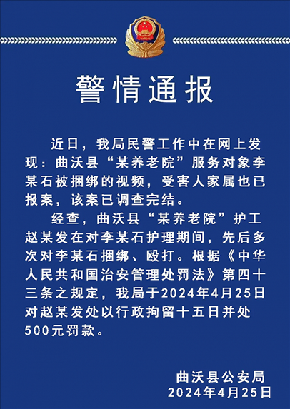 央視網(wǎng)消息:曲沃縣公安局4月25日通報:近日,曲沃縣公安局民警工作中在網(wǎng)上發(fā)現(xiàn)曲沃縣“某養(yǎng)老院”服務對象李某石被捆綁的視頻,受害人家屬也已報案,該案已調(diào)查完結(jié)。