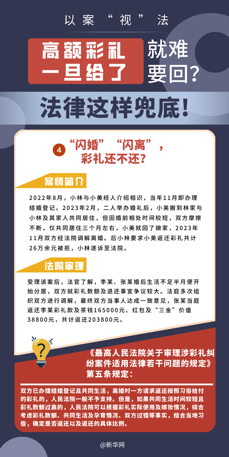 “五一”長(zhǎng)假期間,各地迎來(lái)了婚禮高峰期,“彩禮”話題,尤其農(nóng)村高額彩禮現(xiàn)象備受關(guān)注。破解高價(jià)彩禮,在解決爭(zhēng)議的層面,司法盡了最大努力兜底。本期《以案“視”法》針對(duì)涉“高額彩禮”糾紛,帶大家學(xué)習(xí)相關(guān)法律知識(shí)。