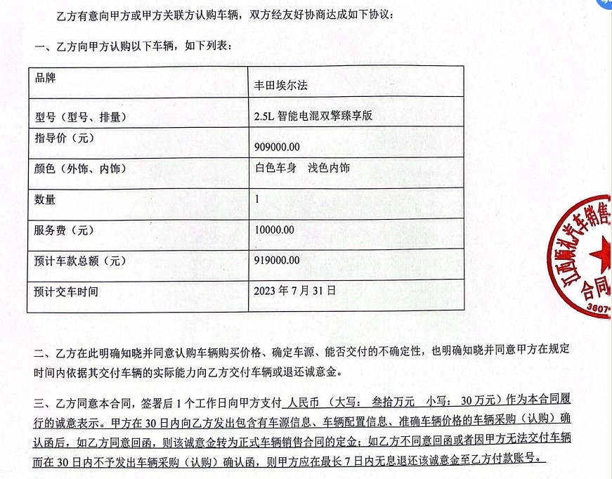 豐田埃爾法汽車,預計車款總額91.9萬元,其中車輛指導價90.9萬元,服務費1萬元,預計交車時間為2023年7月31日。簽訂認購合同當天,任先生支付了30萬元誠意金。