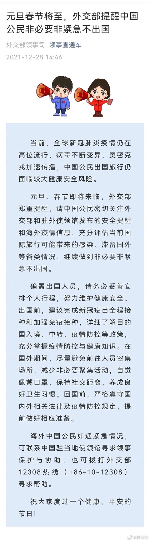 元旦、春節(jié)即將來臨,外交部鄭重提醒,請中國公民密切關(guān)注外交部和駐外使領(lǐng)館發(fā)布的安全提醒和海外疫情信息,充分評估當(dāng)前國際旅行可能帶來的感染、滯留國外等各類情況,繼續(xù)做到非必要非緊急不出國。