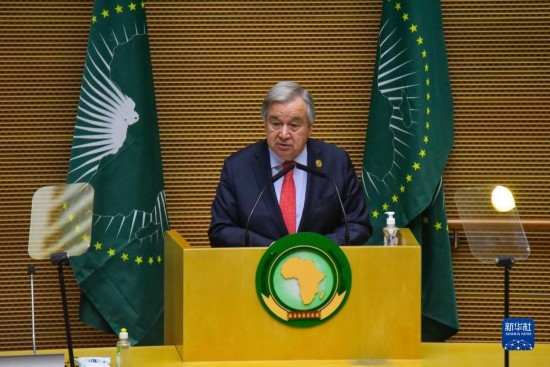 2月18日,在埃塞俄比亞亞的斯亞貝巴,聯(lián)合國秘書長古特雷斯在非盟第36屆首腦會(huì)議上發(fā)表講話。
