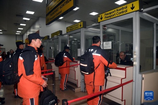 2月16日,中國救援隊隊員在土耳其阿達納國際機場辦理乘機手續(xù)。