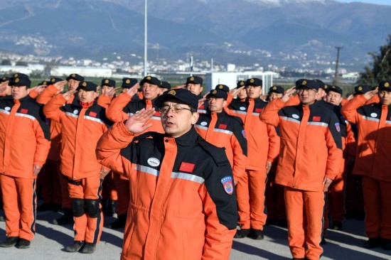 2月10日,中國救援隊隊員在土耳其哈塔伊省安塔基亞市的駐扎營區(qū)參加升旗儀式。