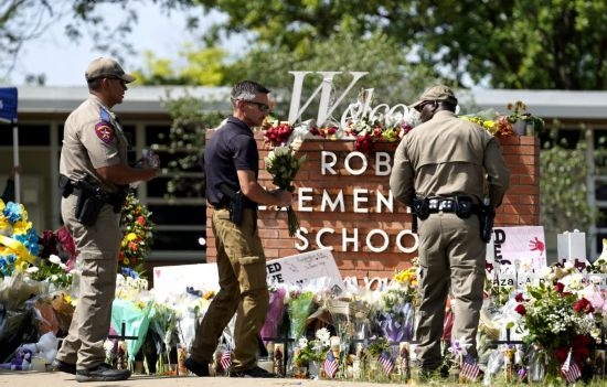 2022年5月27日,警察在美國(guó)得克薩斯州南部尤瓦爾迪市發(fā)生槍擊事件的小學(xué)外擺放花束。新華社記者吳曉凌攝