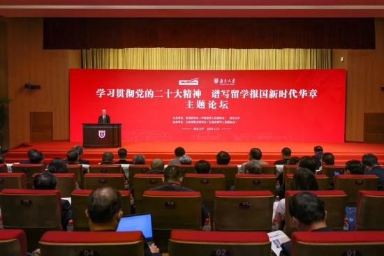 為深入學(xué)習(xí)貫徹落實(shí)黨的二十大精神和習(xí)近平總書記給南京大學(xué)留學(xué)歸國青年學(xué)者重要回信精神,2月19日,由歐美同學(xué)會(中國留學(xué)人員聯(lián)誼會)和南京大學(xué)共同主辦、江蘇省歐美同學(xué)會協(xié)辦的“學(xué)習(xí)貫徹黨的二十大精神 譜寫留學(xué)報國新時代華章”主題論壇在南京隆重舉行。全國人大常委會副委員長、歐美同學(xué)會會長、中國科學(xué)院院士丁仲禮,中央統(tǒng)戰(zhàn)部副部長、國務(wù)院僑務(wù)辦公室主任陳旭,教育部黨組成員、副部長王嘉毅,江蘇省委常委、統(tǒng)戰(zhàn)部部長惠建林,中國科學(xué)院院士、南京大學(xué)黨委書記譚鐵牛出席論壇并致辭。歐美同學(xué)會黨組書記、秘書長王丕君主持論壇開幕式,南京大學(xué)黨委常務(wù)副書記楊忠主持主論壇。