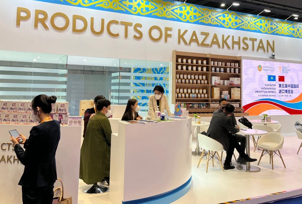 這是2022年11月6日在第五屆進博會上拍攝的哈薩克斯坦產品展區(qū)。