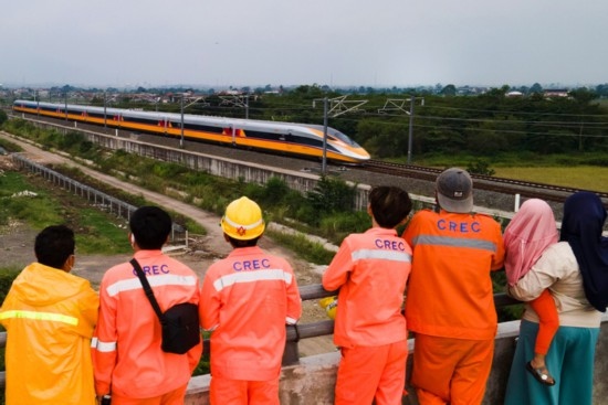 2022年11月16日,在印度尼西亞萬隆,雅萬高鐵建設(shè)者和當(dāng)?shù)孛癖娪^看高速鐵路綜合檢測車行駛在雅萬高鐵試驗段(無人機照片)。新華社發(fā)(李培養(yǎng) 攝)