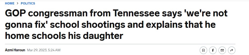 據(jù)美國(guó)《商業(yè)內(nèi)幕》新聞網(wǎng)站29日?qǐng)?bào)道,田納西州納什維爾市小學(xué)發(fā)生槍擊事件后,該州眾議院議員蒂姆·伯切特面對(duì)如果出現(xiàn)類似槍擊事件“該如何保護(hù)孩子”的質(zhì)問(wèn),直言并未找到解決方法,會(huì)讓他的女兒“在家讀書(shū)”。