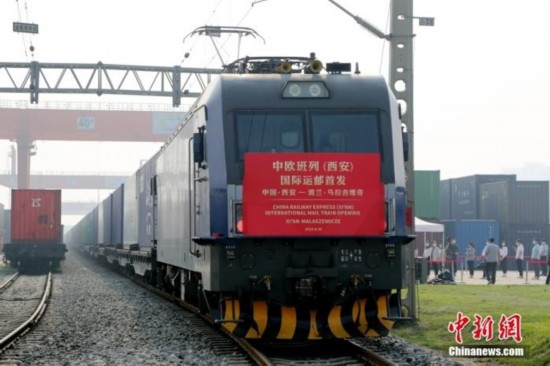 資料圖:2022年9月16日,中歐班列(西安)國際運(yùn)郵專線首次開行,列車裝載著國際郵件、包裹、商業(yè)快件從西安國際港站駛出,經(jīng)阿拉山口口岸出境,將于約12天后抵達(dá)波蘭馬拉舍維奇,郵件再交由波蘭郵政轉(zhuǎn)運(yùn)到歐洲各國。 中新社記者 張遠(yuǎn) 攝