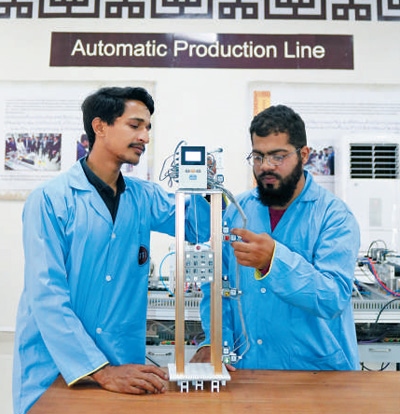 在巴基斯坦魯班工坊工業(yè)自動化和機器人專業(yè)課堂上,學生模擬實踐電梯組裝運行技術(shù)。 巴基斯坦魯班工坊供圖