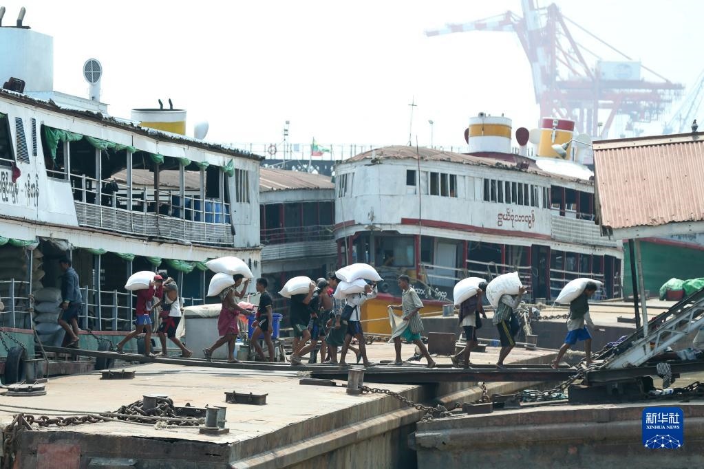 4月27日,工人在緬甸仰光一處碼頭搬運(yùn)大米。