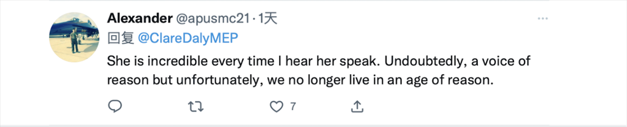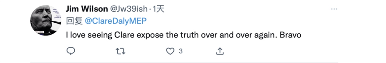 克萊爾·戴利的推文正是她在歐洲議會(huì)發(fā)言中所提到的內(nèi)容。在視頻中,克萊爾·戴利首先抨擊了西方對(duì)華問題上的雙標(biāo)行為。她在發(fā)言時(shí)稱,“人們?cè)诒┞斗至训耐瑫r(shí)談?wù)撝鴪F(tuán)結(jié),他們一邊在歐盟向?yàn)蹩颂m提供武器,一邊與中國談?wù)摵推?。他們哀嘆中國在臺(tái)灣地區(qū)‘挑釁’,但對(duì)美國干涉國際公認(rèn)的中國領(lǐng)土卻只字未提?!?/p>