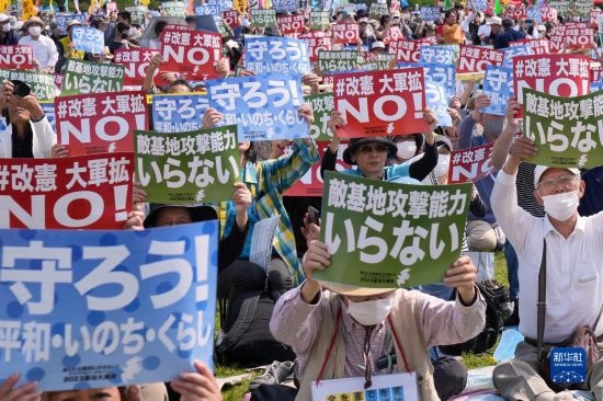 5月3日是日本憲法紀念日。當天,約2.5萬名日本民眾聚集在東京有明防災公園的廣場上,舉行了守護憲法集會,他們打出守護憲法、反對強軍擴武、不要反擊能力、反對修改憲法等內(nèi)容的標語和旗幟,呼吁守護憲法、守護和平。