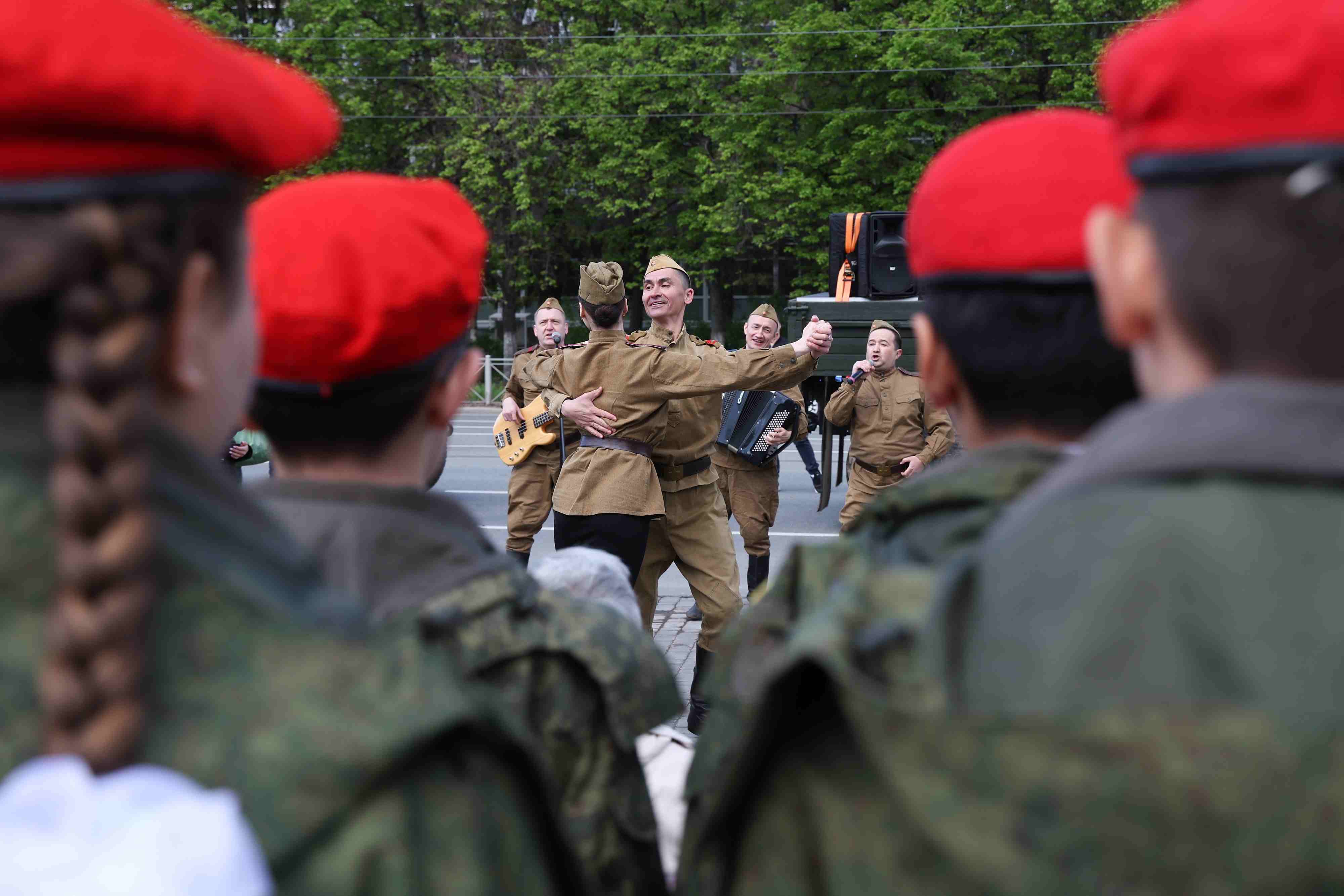 當(dāng)?shù)貢r(shí)間2023年5月8日,俄羅斯喀山,舞者在為二戰(zhàn)老兵舉行的音樂會(huì)上表演。 視覺中國(guó)
