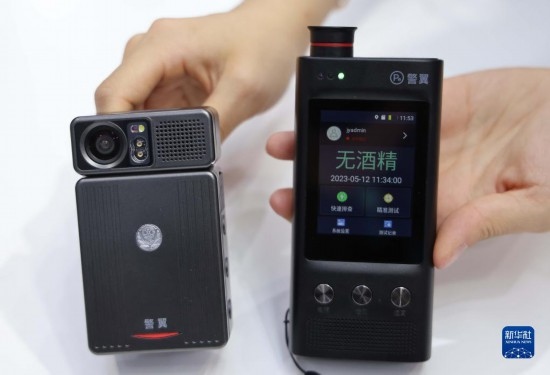 5月12日,工作人員在展示5G警翼執(zhí)法記錄儀(左)和酒檢儀。
