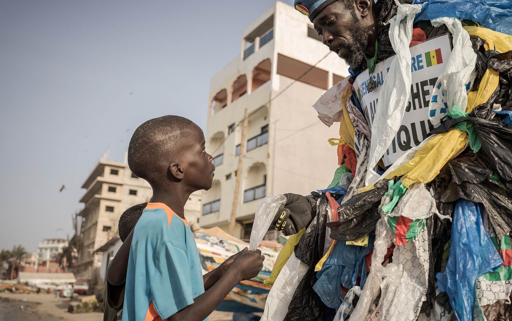 當(dāng)?shù)貢r間2023年4月5日,塞內(nèi)加爾達喀爾,49歲的塞內(nèi)加爾環(huán)?;顒蛹夷拧し?,被稱為“塑料人”,和一個孩子在海灘上散步時拿著一個塑料包裝,提醒人們注意使用一次性塑料的污染。