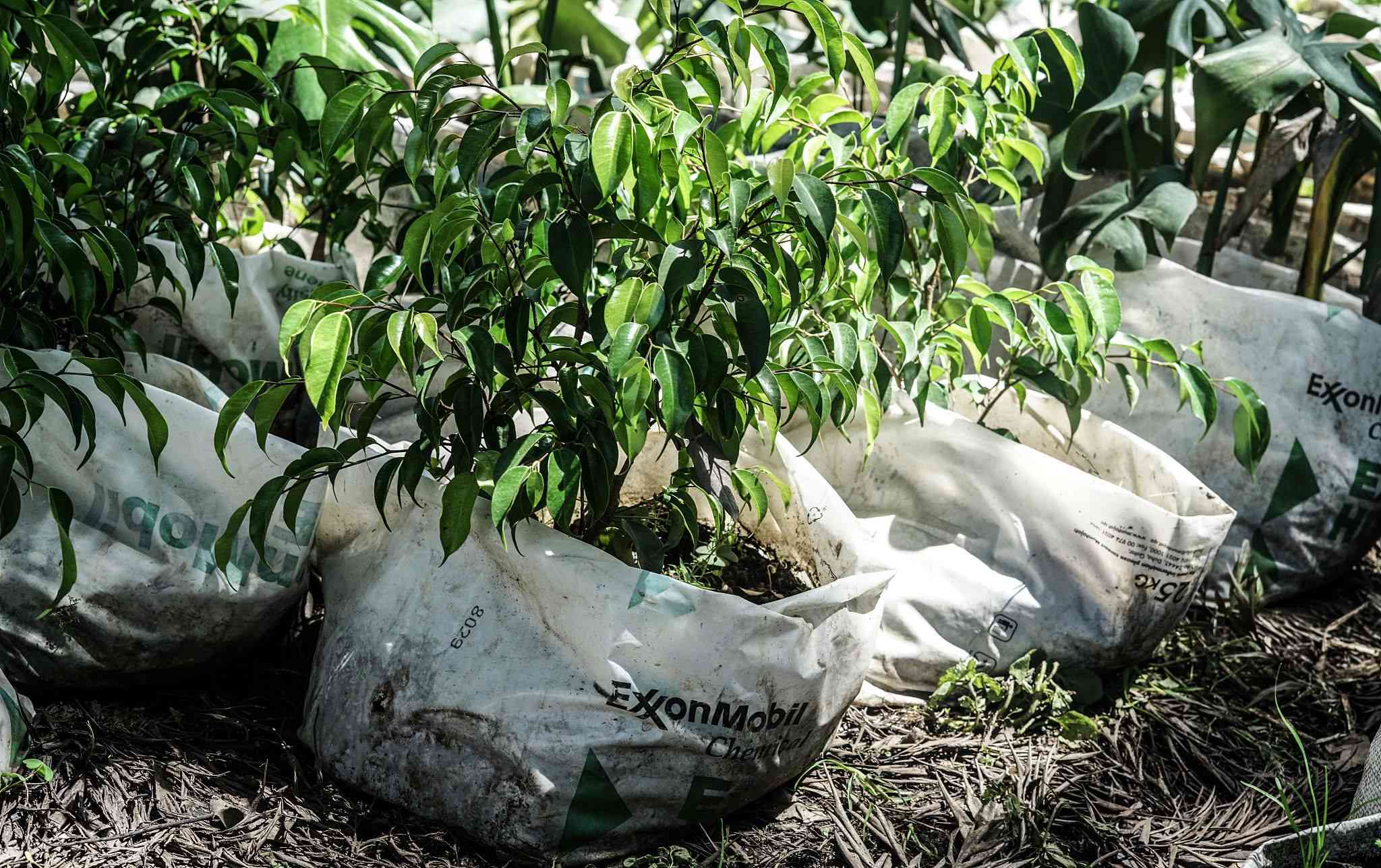 當(dāng)?shù)貢r間2023年5月7日,肯尼亞納庫魯?shù)拿缙岳?,??松梨诎b袋包裹著一棵樹苗。隨著世界充斥著塑料廢物,政府間談判委員會(INC)內(nèi)塑料條約的支持者正在倡導(dǎo)一項具有法律約束力的文書,減少石化工業(yè)生產(chǎn)的原生塑料。