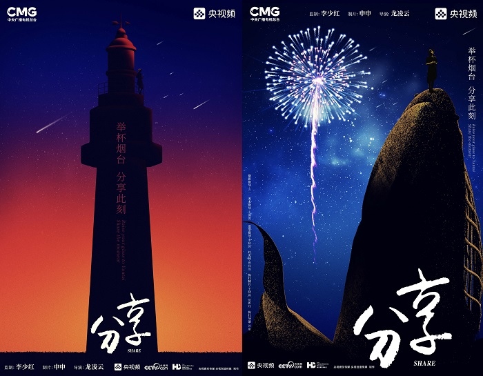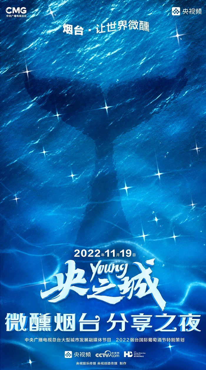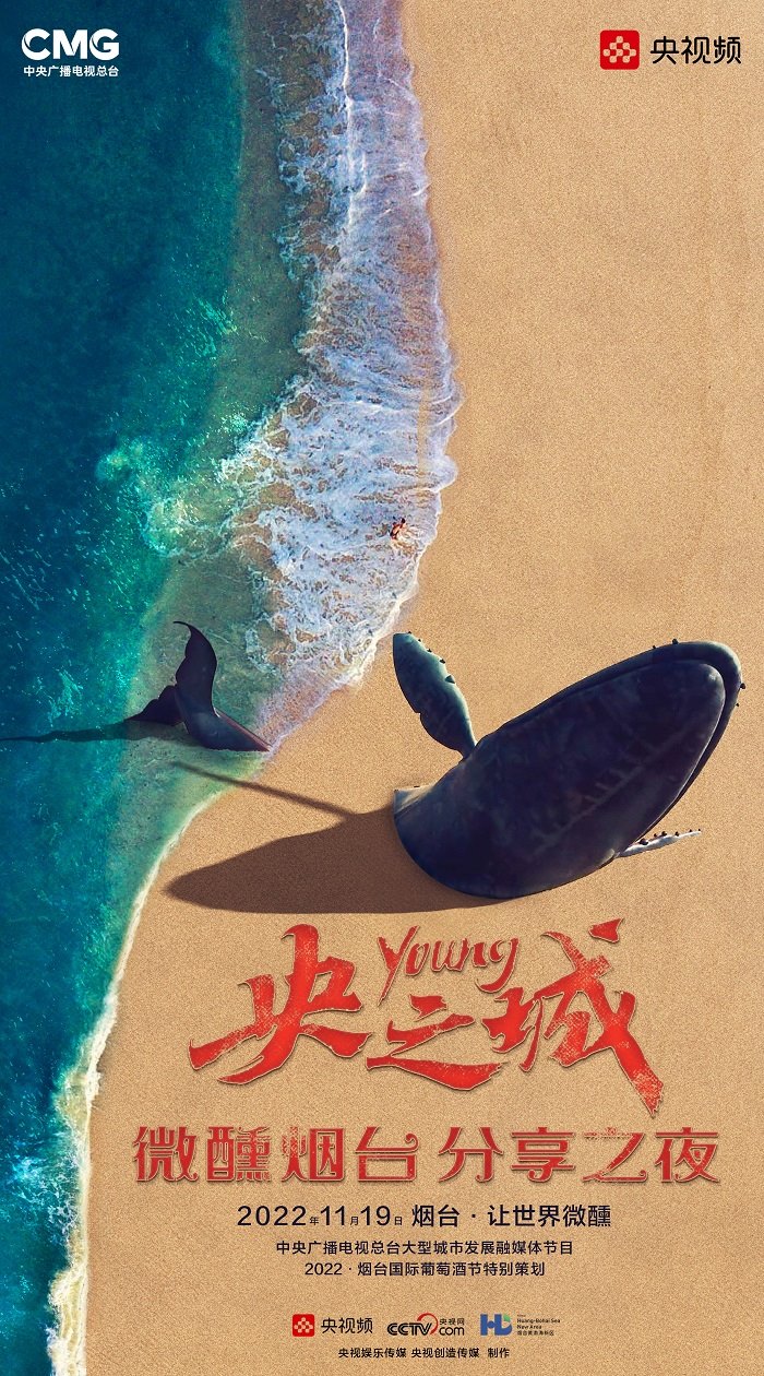田雨峰在拍攝短片海報(bào)用圖的時(shí)候,首先確定了畫面中最突出的形象元素,同時(shí)也是交代短片故事發(fā)生地的地標(biāo)性雕塑——“孤獨(dú)的鯨“。這個(gè)雕塑如今是煙臺開發(fā)區(qū)金沙灘的網(wǎng)紅打卡地,網(wǎng)友為其起名”鯨落“。碩大的鯨魚從淺海處躍出海面,魚頭和魚尾凌空飛躍,其身體的一部分似藏在沙灘里。這是一個(gè)在真實(shí)生活中不會出現(xiàn)的景象,充滿了動畫般的奇幻想象,位于煙臺碧藍(lán)的海邊,又天然地帶上了一點(diǎn)浪漫的色彩。短片中”舉杯煙臺,分享此刻“的Slogan綴在尾聲,分享的正是煙臺這座城市獨(dú)有的沙灘、夜空、煙火和人間。短片中可以娓娓道來般逐漸交代,但在海報(bào)里,二環(huán)用畫面底部金色沙灘上”孤獨(dú)的鯨“,畫面上方如大海般湛藍(lán)的星空,星空中綻放的煙花,鎖定了地球上唯一的煙臺。田雨峰鏡頭中短片主角的人物照被二環(huán)拼貼到童話般色彩斑斕的畫面里,被著意縮小了的黑色小女孩于是成為一切奇幻、浪漫想象的迸發(fā)之源,和世界分享一個(gè)妙趣橫生的想法。