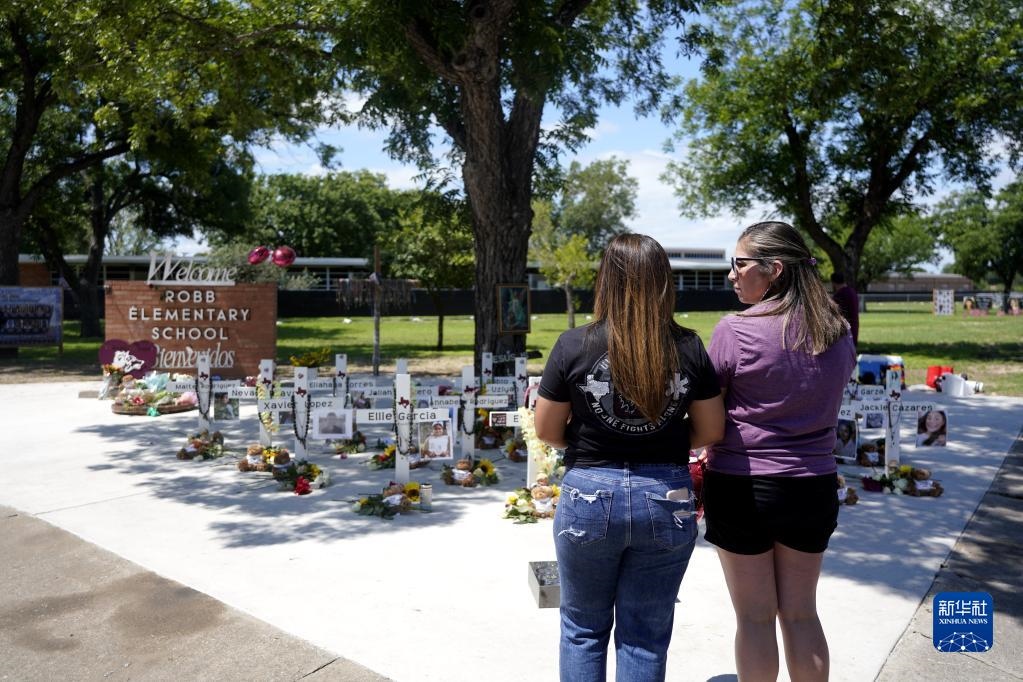 5月24日,美國(guó)得克薩斯州小城尤瓦爾迪的原羅布小學(xué)外擺放著悼念槍擊遇害者的物品。