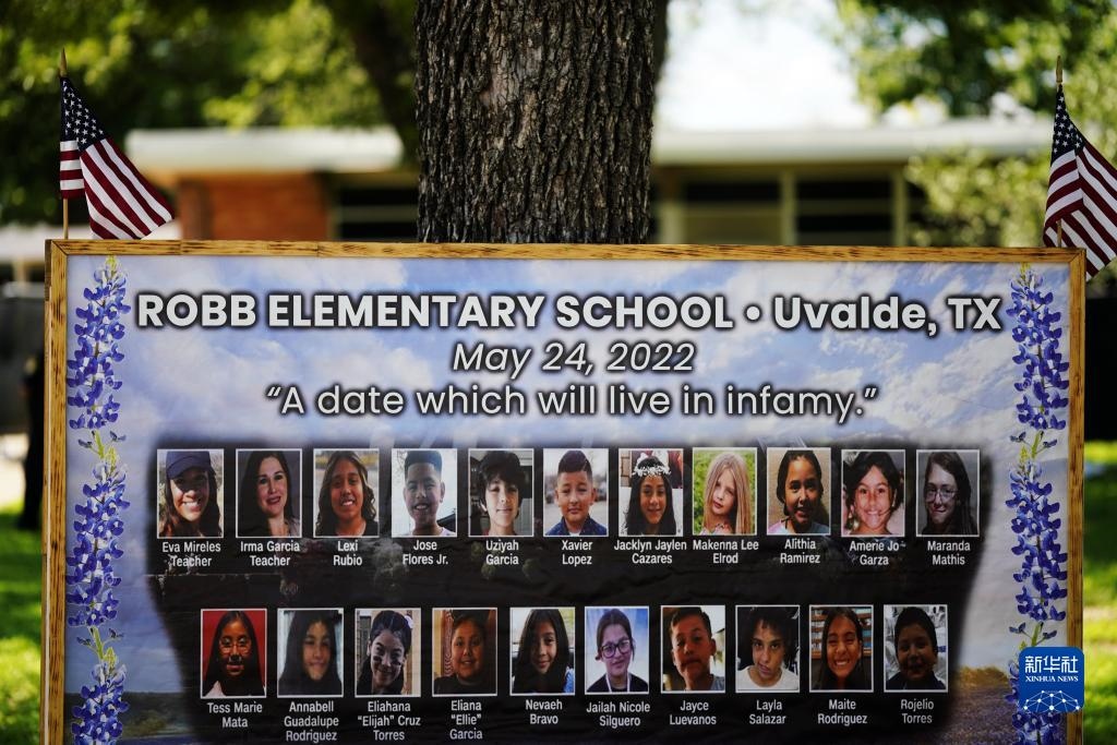 5月24日,美國(guó)得克薩斯州小城尤瓦爾迪的原羅布小學(xué)擺放著校園槍擊遇害者的照片。