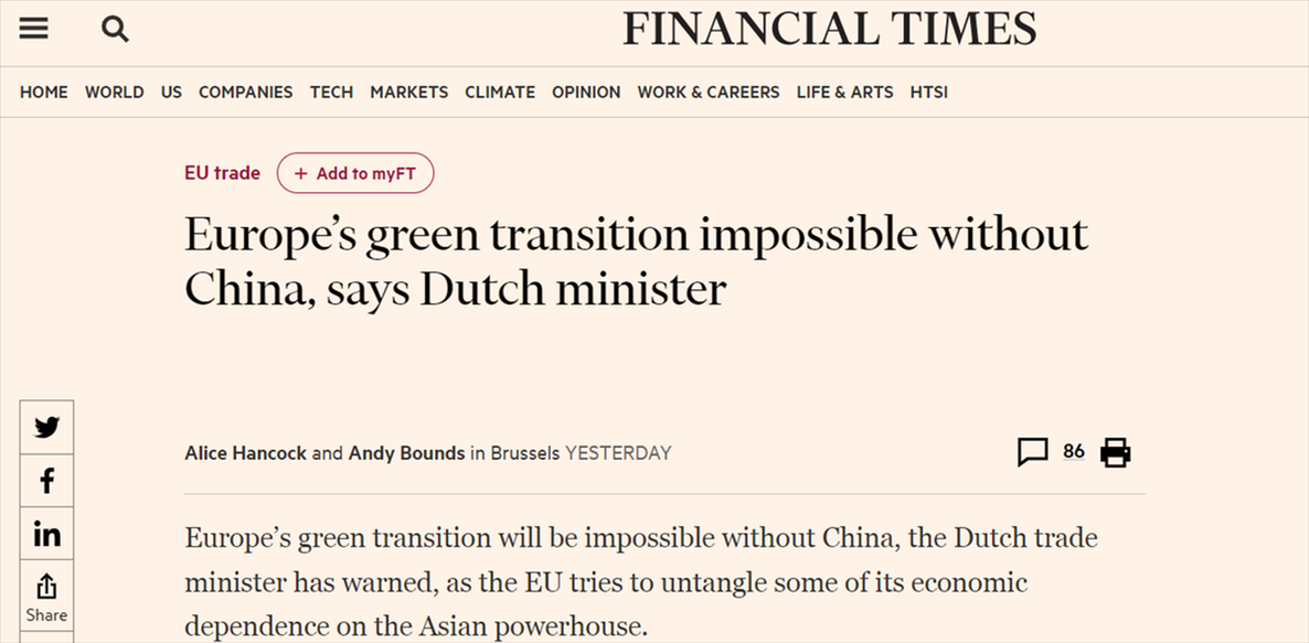 英國(guó)《金融時(shí)報(bào)》28日?qǐng)?bào)道稱,荷蘭外貿(mào)與發(fā)展合作大臣施賴納馬赫爾警告稱,沒(méi)有中國(guó),歐洲的綠色轉(zhuǎn)型將無(wú)法實(shí)現(xiàn)。