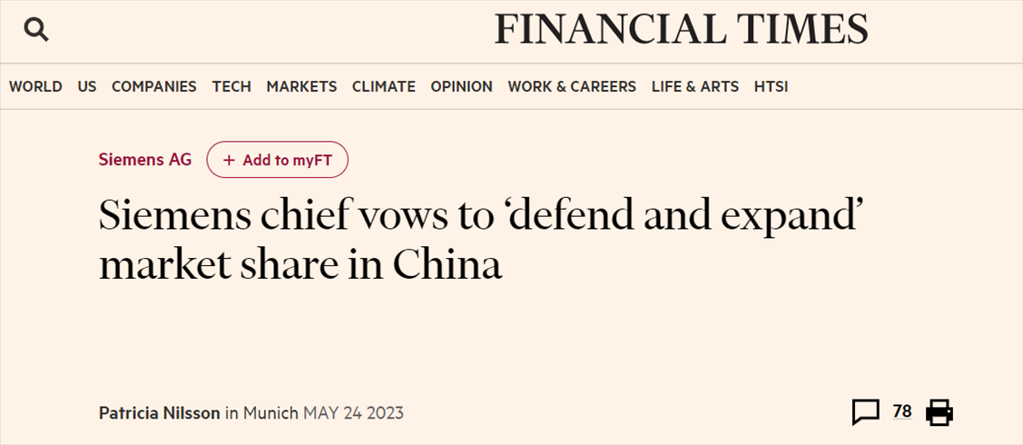 西門(mén)子首席執(zhí)行官博樂(lè)仁(Roland Busch)近期在接受英國(guó)《金融時(shí)報(bào)》采訪時(shí)表示,中國(guó)客戶是推動(dòng)這家德國(guó)工程巨頭持續(xù)創(chuàng)新的動(dòng)力,他要“捍衛(wèi)”和“擴(kuò)大”公司在中國(guó)的市場(chǎng)份額。