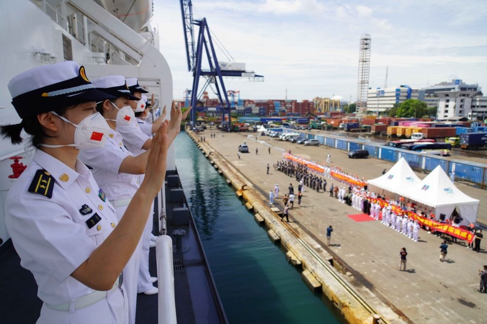 2022年11月18日,在印度尼西亞首都雅加達的丹戎不碌港,中國海軍“和平方舟”號醫(yī)院船官兵向送行人員揮手告別。