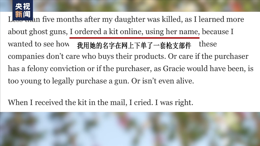 槍擊案發(fā)生不到五個月后,遇害者之一格雷斯·穆爾伯格的父親用已逝女兒的名字成功訂購到一套“幽靈槍”的槍支部件,他在《華盛頓郵報》分享了這個經(jīng)歷,以此揭露“幽靈槍”行業(yè)的黑暗。