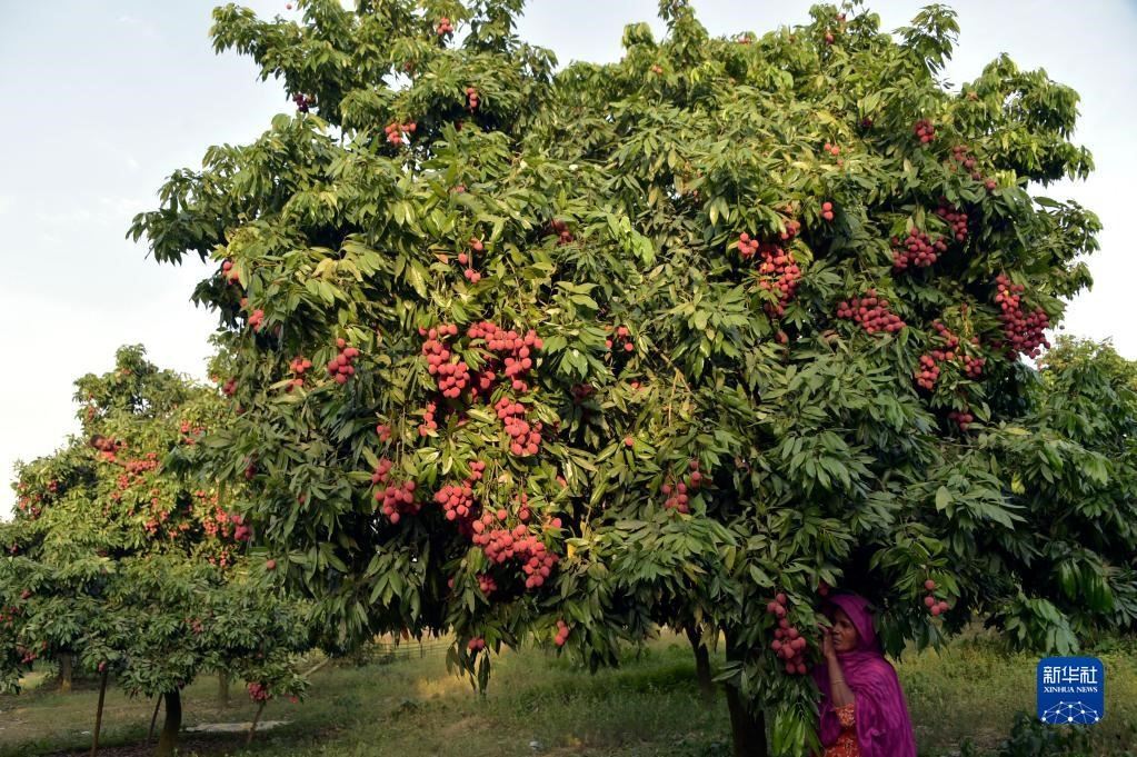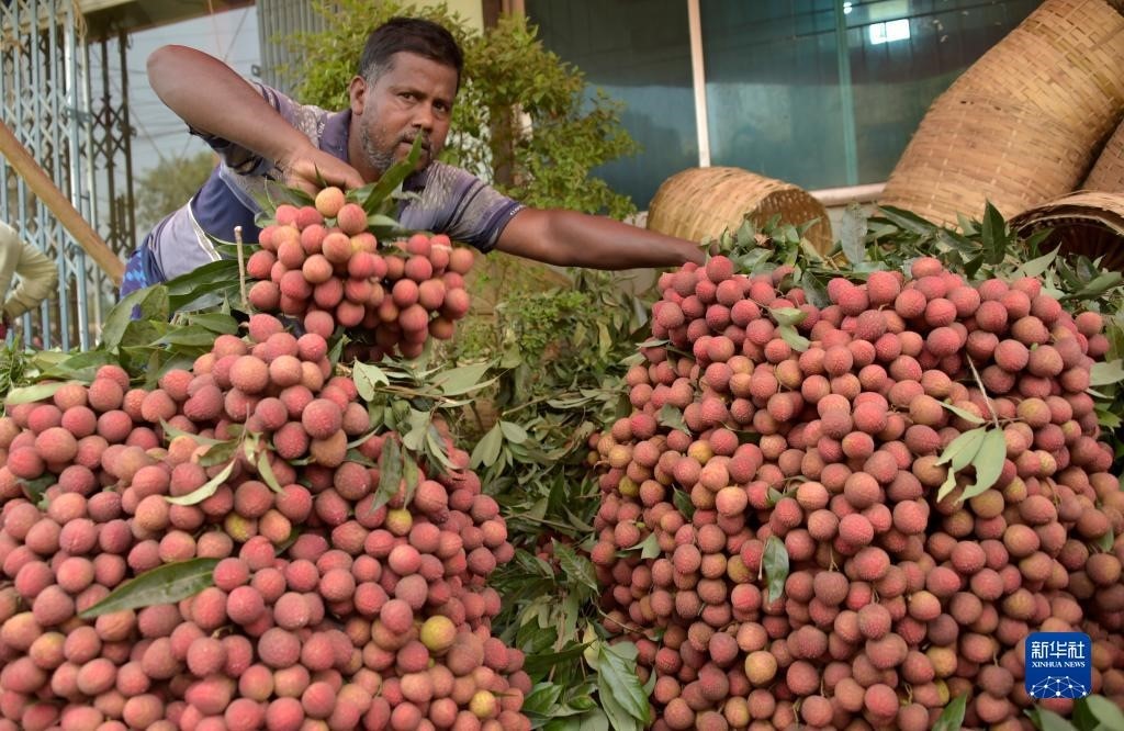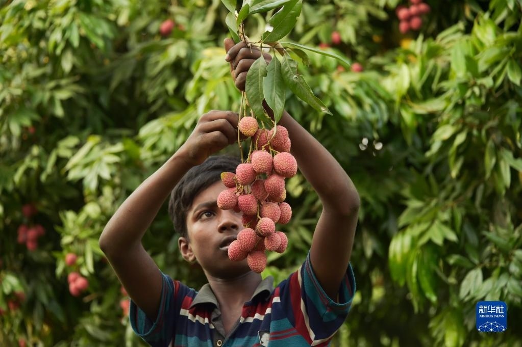 6月4日,農(nóng)民在孟加拉國迪納杰布爾的果園里采摘荔枝。新華社發(fā)