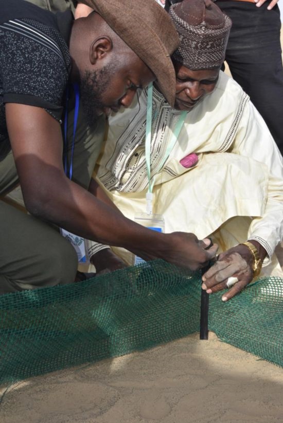 這位卡諾州環(huán)境部生態(tài)和林業(yè)主管按照中國(guó)專家的講授和示范,把條狀的可降解乳酸纖維沙袋灌滿沙子,擺成方格形狀,又拿起沉甸甸的鐵錘,把小樁子敲進(jìn)沙地里,圍上高密度固沙網(wǎng)。