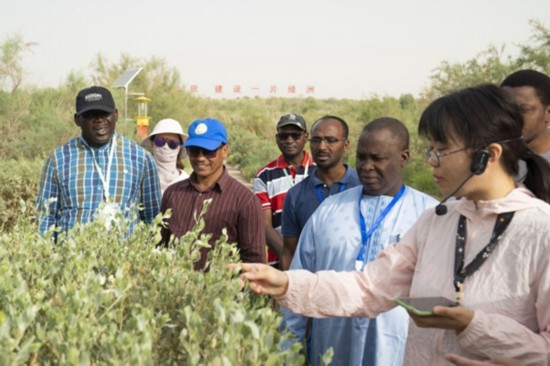6月13日,在中國(guó)科學(xué)院新疆生態(tài)與地理研究所策勒沙漠研究站,中方專家向非洲和中亞學(xué)員介紹荒漠植物。新華社記者 周生斌 攝