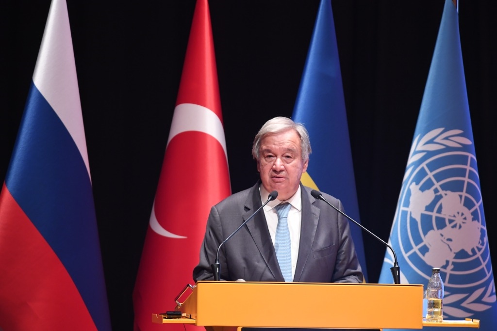 2022年8月20日,在位于土耳其伊斯坦布爾的土耳其國防大學內的黑海糧食外運聯(lián)合協(xié)調中心,聯(lián)合國秘書長古特雷斯出席新聞發(fā)布會。新華社記者沙達提攝